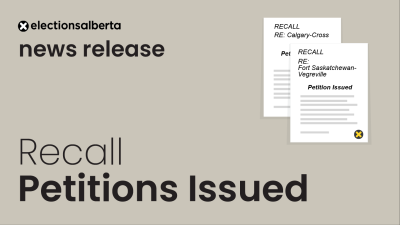 EDMONTON – Alberta’s Chief Electoral Officer, Gordon McClure, has received petition applications to recall the following three Members of the Legislative Assembly and determined all applications meet the requirements of section 3(1) of the Recall Act. Electoral Division 27 – Edmonton-Beverly-Clareview, Peggy Wright, Electoral Division 57 – Cypress-Medicine Hat, Justin Wright, and Electoral Division 64 – Grande Prairie-Wapiti, Ron Wiebe. As required by s.3(3) of the Act, written notice of the approval was issued on…