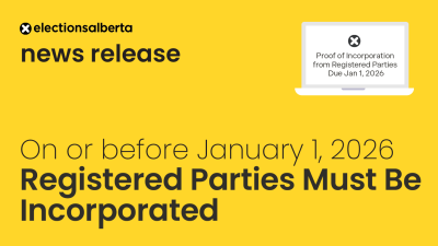 EDMONTON – Legislative changes brought about by the passage of Bill 54, which took effect July 4, 2025, to section 7(2.03) of the Election Finances and Contributions Disclosure Act (EFCDA) now require all registered political parties to be incorporated as a society under the Societies Act, a company under Part 9 of the Companies Act, or a corporation under the Canada Not-for-profit Corporations Act (Canada). Section 56(1) of the EFCDA requires all the parties to…